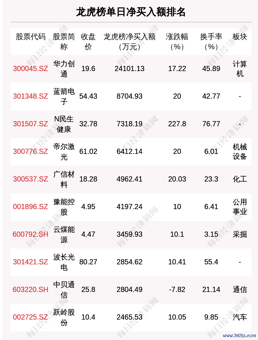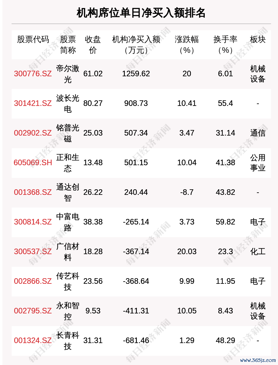 在龙虎榜中,涉及机构专用席位的个股有22只,净买入额前三的是帝尔激光、波长光电、铭普光磁,分别为1259.62万元、908.73万元、507.34万元。