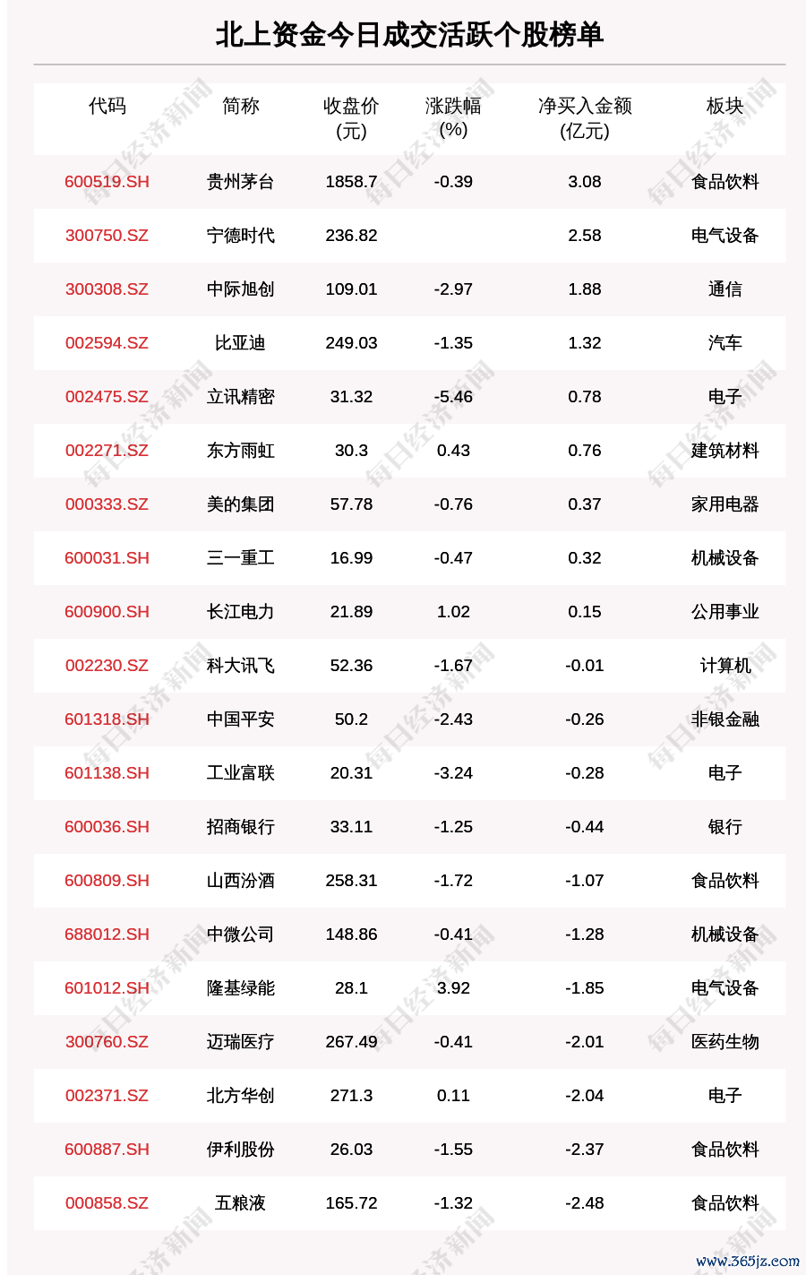 9月5日,北上资金成交活跃个股榜单中,净买入个股共9只,金额最多的是贵州茅台(600519.SH,收盘价:1858.7元),净买入3.081亿元;净卖出个股共11只,金额最多的是五粮液(000858.SZ,收盘价:165.72元),净卖出2.476亿元。