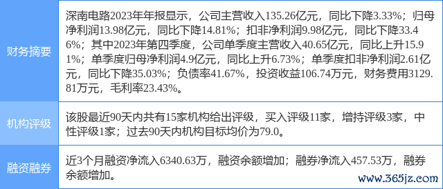 2024年3月17日,开源证券研究员罗通,刘天文发布了对深南电路的研报《公司信息更新报告:2023Q4业绩环比改善,FC-BGA项目推进顺利》,该研报对深南电路给出“买入”评级。研报中预计2024-2026年归母净利润为16.36/19.56/22.98亿元(前值为17.90/21.65亿元),对应EPS为3.19/3.81/4.48元(前值为3.49/4.22元),当前股价对应PE为26.2/21.9/18.7倍,公司布局高端PCB产品,业绩有望稳步增长,维持“买入”评级。证券之星数据中心根据近三年发布的研报数据计算,该研报作者对此股的盈利预测准确度为74.74%。