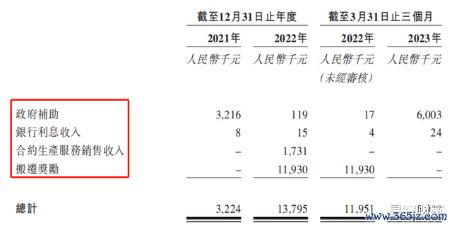 2021年、2022年和2023年一季度,盛禾生物仅有一些政府补助,银行利息等其他收入。其中2021年收入322.4万元,2022年收入1379.5万元,2023年一季度收入602.7万元。