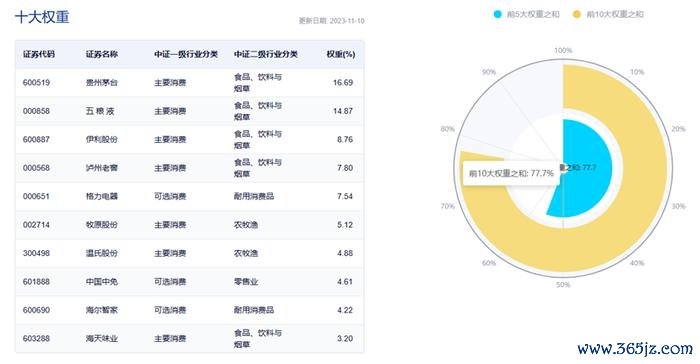 数据显示,截至2023年11月10日,该指数前十大权重股包括贵州茅台、五粮液、伊利股份、泸州老窖、格力电器等,前十大权重股合计占比约为77.7%。(数据