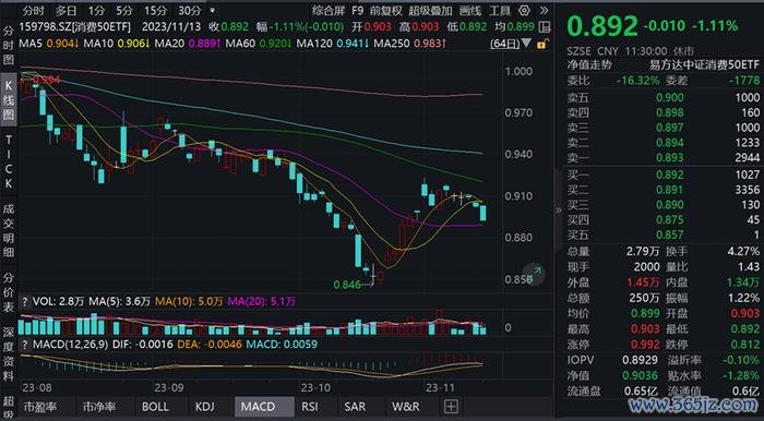 截至2023年11月13日中午收盘,消费50ETF(159798)回调蓄势,跌超1%,成交额持续扩大,市场交投活跃。