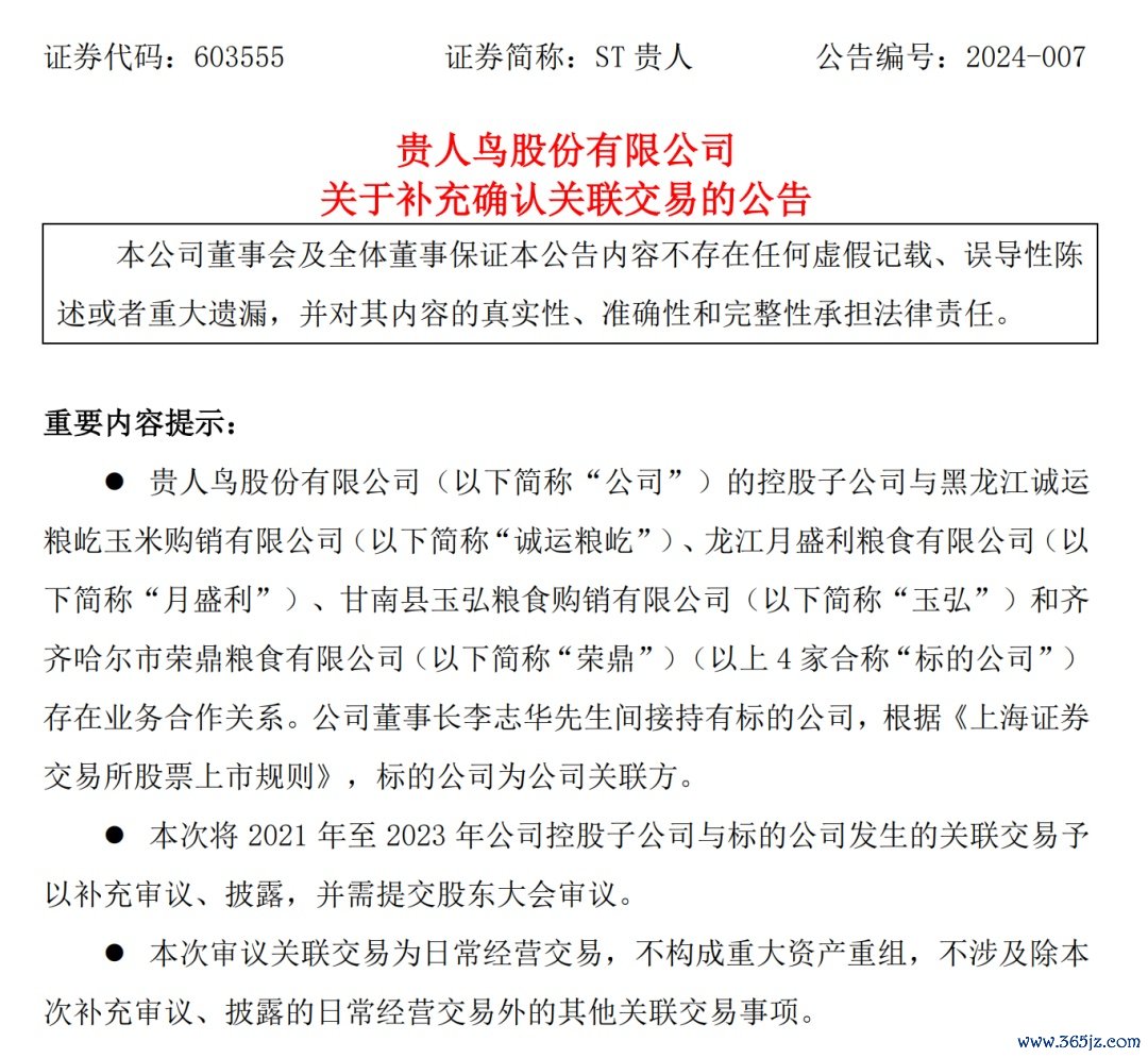在2023年年度审计的关键时刻,ST贵人(贵人鸟(603555)股份有限公司,股票代码:603555)承认了与多家粮食供应商存在关联关系。公司于1月19日晚间披露,其董事长李志华间接持有黑龙江诚运粮屹玉米购销有限公司(下称“诚运粮屹”)等4家公司股权,这4家公司与其控股子公司存在业务合作关系。根据相关规定,4家公司为公司关联方。